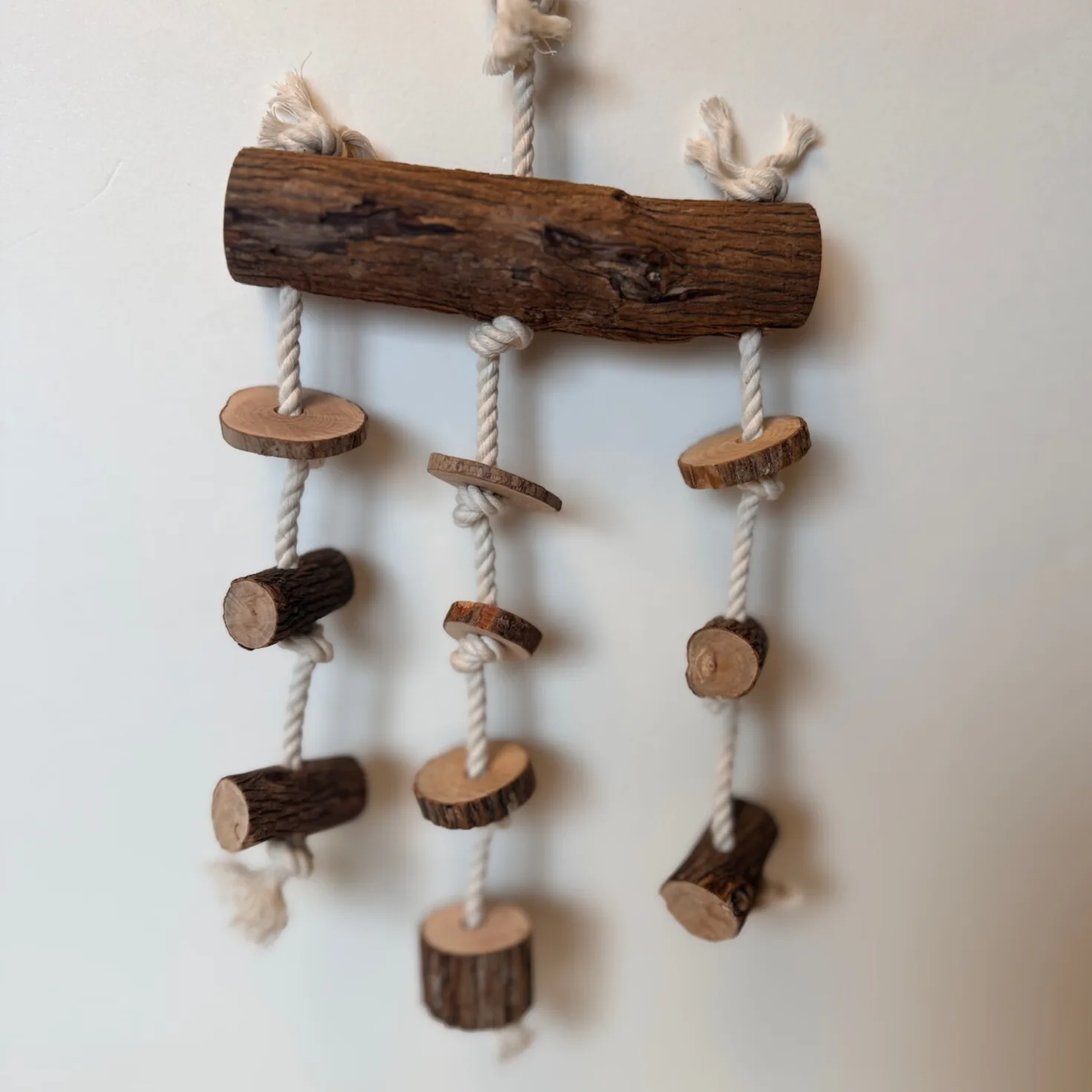 - メイン木材から最下部のピースまで約27㎝、ロープの上部に付属のステンレス取付金具をセットすると最上部から最下部まで35㎝になります。高さに余裕があるケージへの設置をおすすめ!