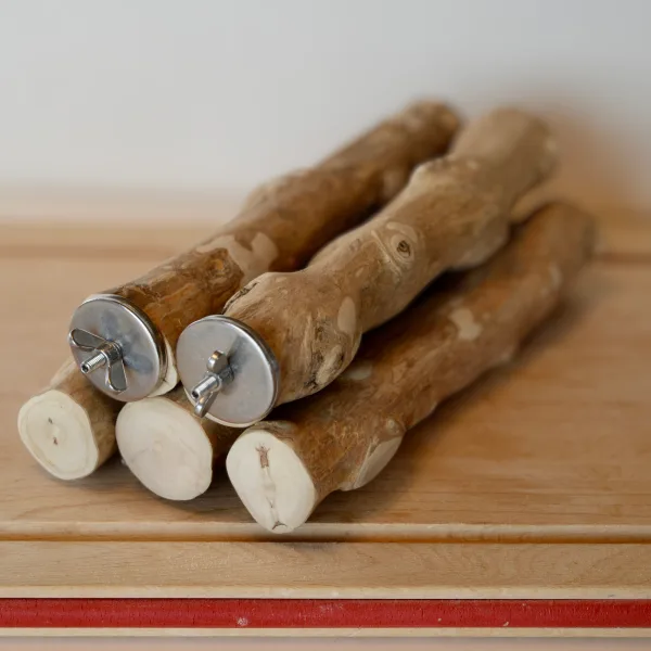 かじる・遊ぶ・つかむといった自然な行動(エンリッチメント)を支えるため、国内ではあまり流通しない天然木を厳選し、一本ずつ丁寧に仕上げています。
